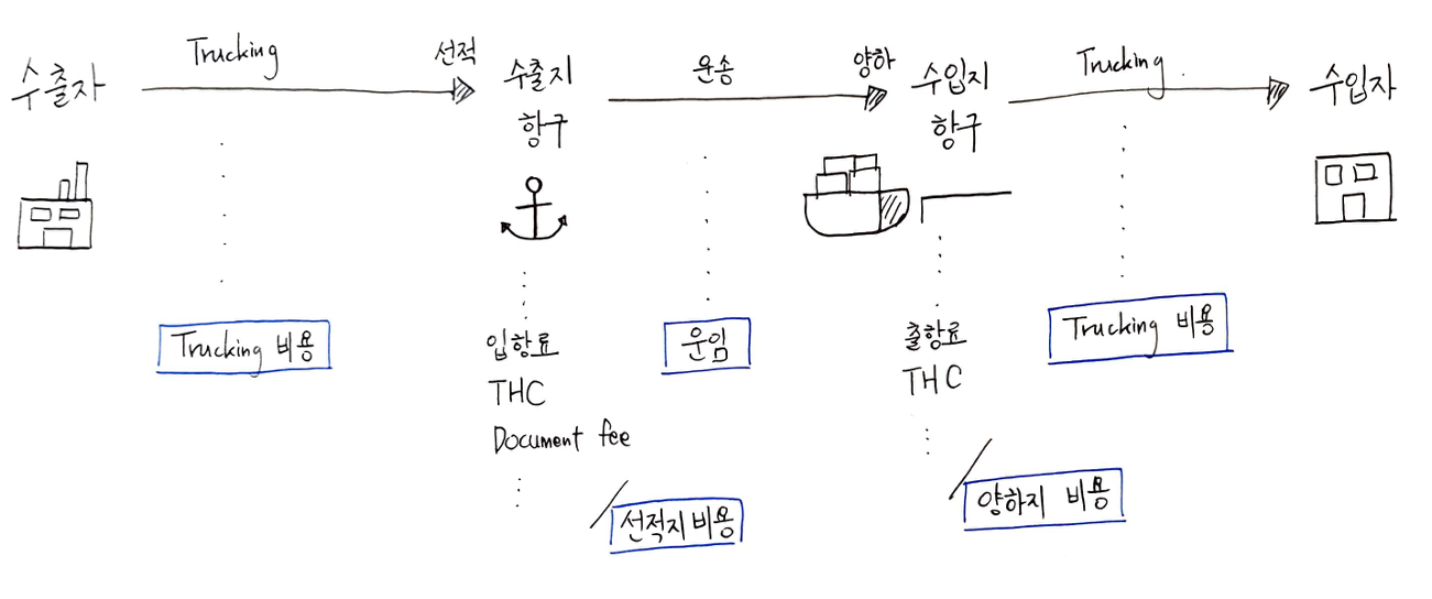 수출자 →Trucking 비용 + 선적지 비용 + 해상운임 + 양하지 비용 + Trucking 비용 → 수입자