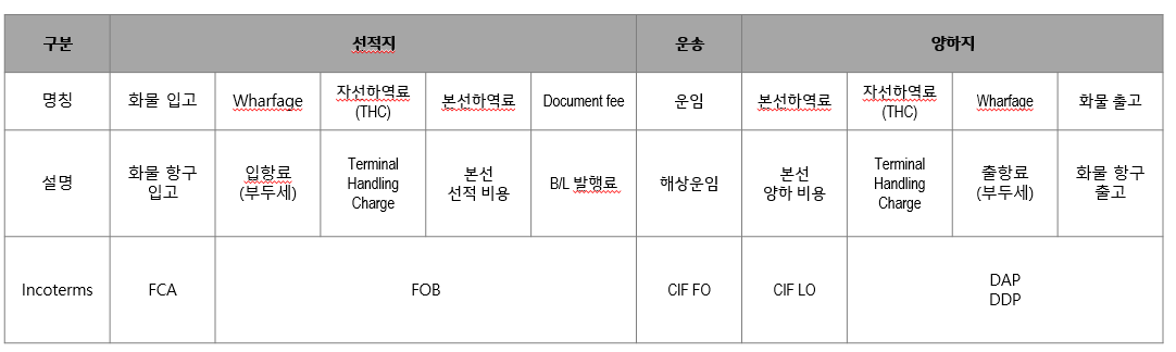 → 해상운임 외 모든 물류비용은 선적지 항구, 양하지 항구에서 각각 1회씩 발생